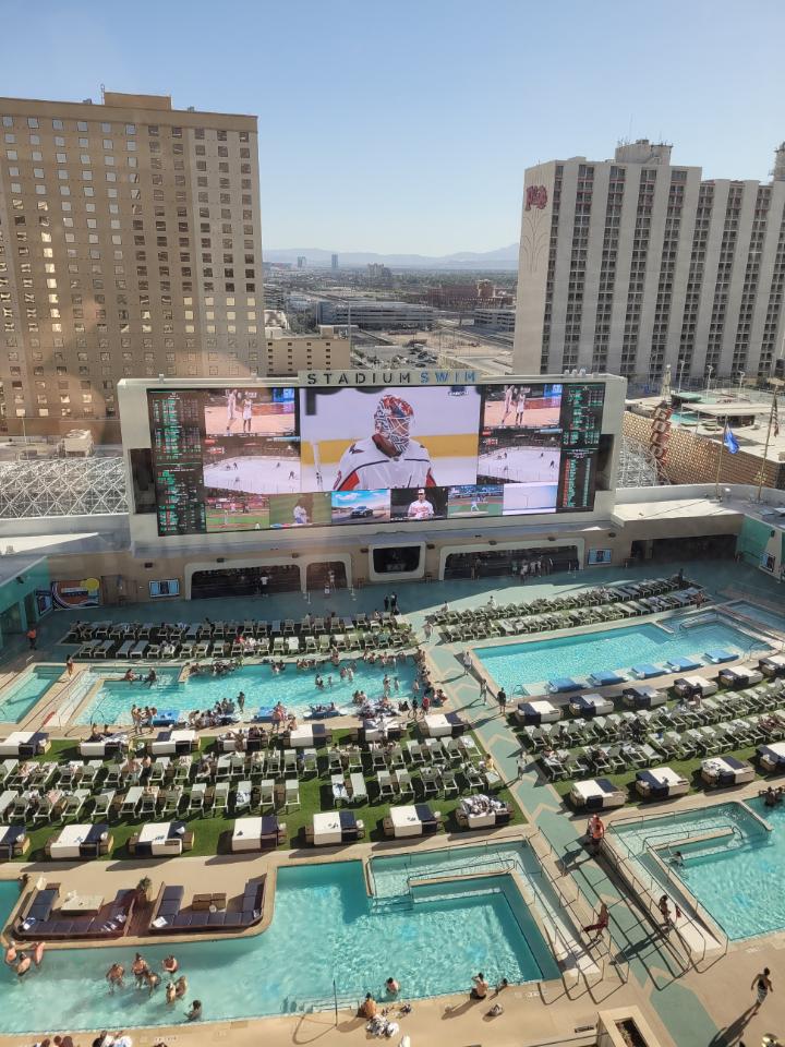 Starting with the room, perhaps the best thing besides the view is our space included TWO king beds. Personally, I loved the décor and even thought the bathroom wallpaper was fantastic. From a comparison standpoint I found the room to be better than the Mirage or Golden Nugget. My biggest gripe would be that there were no plugs close to the bed, so charging your phone was a bit of a pain. Chasing Tip: if you get a view facing the Stadium Swim just remember the screens NEVER turn off and you’ll need to pull those blinds tight at night.